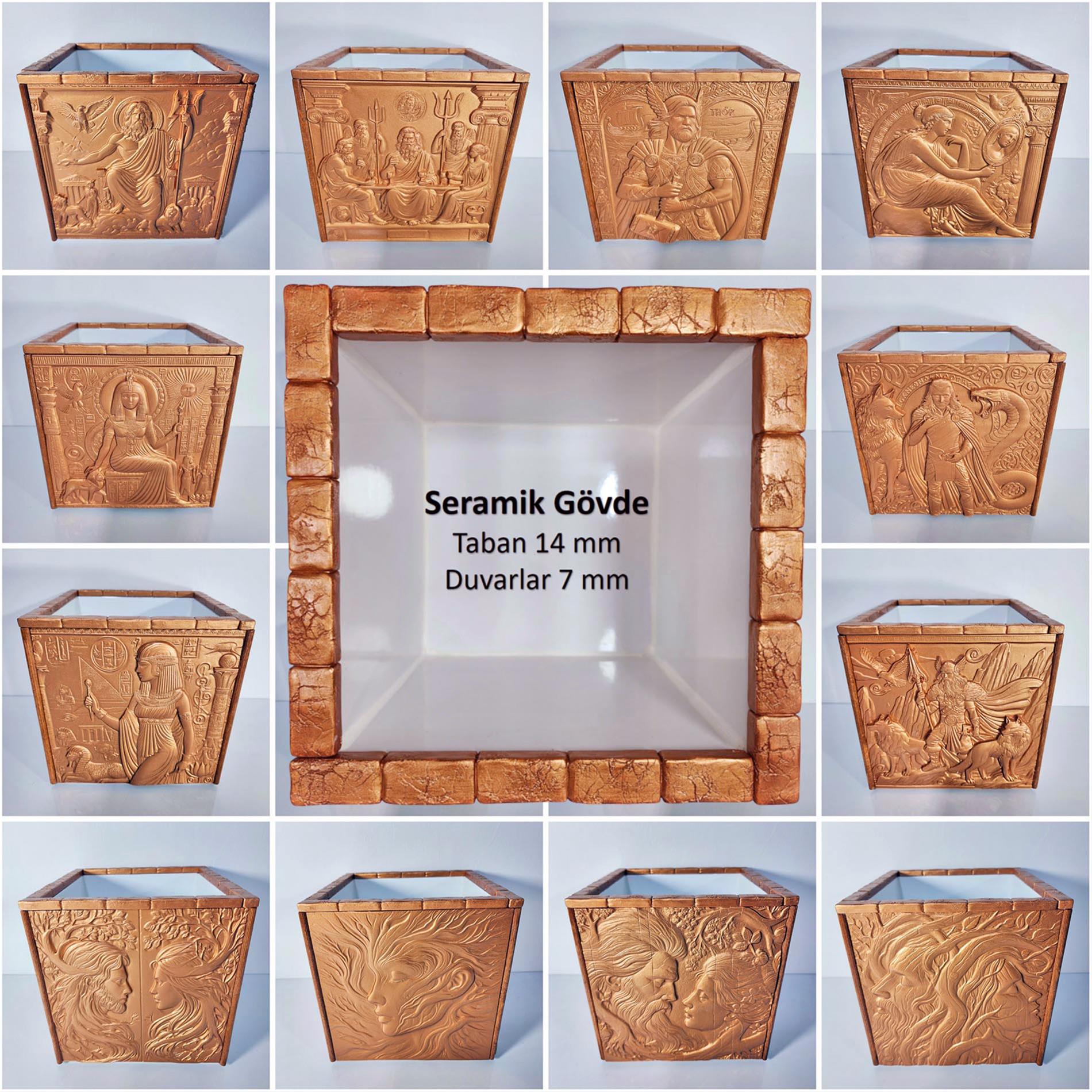 Seramik Yapıştırma Tekniğiyle üretilen saksı üzerine 4 farklı temada üç boyutlu taş tablo yapıştırılarak tamamlanmıştır.